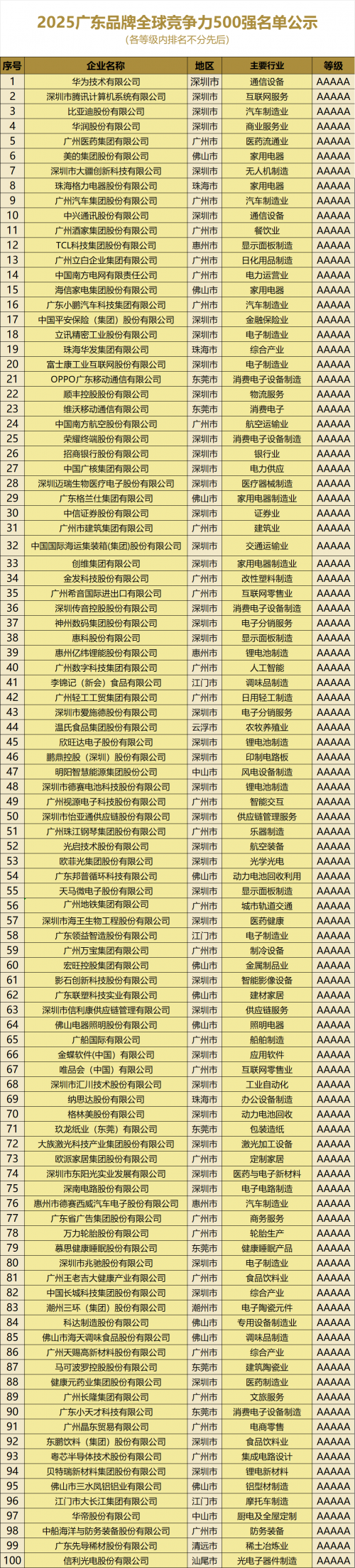 2026年1月,广东省企业品牌建设促进会广东品牌全球竞争力实验室按照《企业品牌全球竞争力评价通则》团体标准相关评价程序,通过企业自主申报、专业机构及社会组织推荐,综合运用大数据分析、实地调研与专家评审等方式,最终评定出“2025广东品牌全球竞争力500强”名单。华为、腾讯、比亚迪、华润、广药、美的、大疆、格力、广汽、中兴、广州酒家、TCL、立白、南方电网、海信、小鹏、中国平安、立讯精密、华发、富士康、OPPO、顺丰、vivo、南方航空、荣耀、招商银行、中国广核、迈瑞医疗、格兰仕、中信证券、中集、创维、金发、怡亚通、希音、传音、惠科、亿纬锂能、李锦记、爱施德、欣旺达、温氏、欧菲光、万宝、影石、联塑、广船、佛山照明、金蝶、纳思达、格林美、玖龙、大族激光、欧派、深南电路、慕思、王老吉、海天、马可波罗、长隆、步步高、粤芯半导体、贝特瑞、凤铝、大长江、华帝、先导稀材、信利光电、喜之郎、名创优品、天珑、广电运通、康冠、倍思、江波龙、高景太阳能、冠宇电池、深信服、货拉拉、大洋电机、尚品宅配、华利实业、南玻、生益、佳都、中农网、康方生物、美涂士、优合、维达纸业、漫步者、东鹏控股、快尚时装、星湖生物、丽珠医药、珠江啤酒、雷士光电、安吉尔、坚美铝材、万家乐等500家获评AAA及以上等级的企业入选。